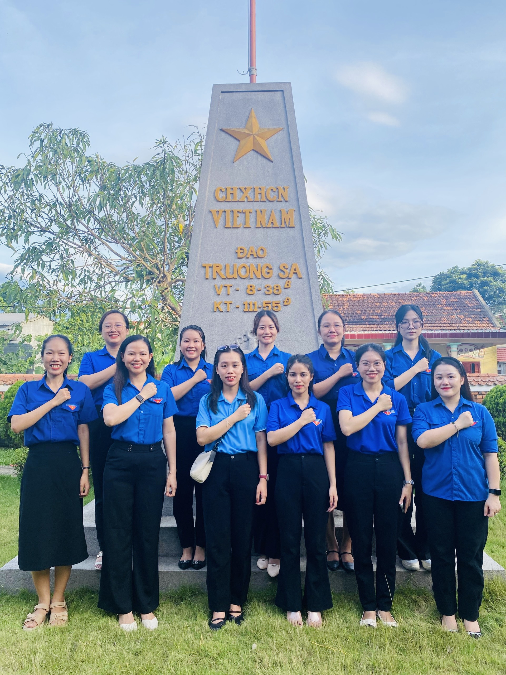 Đoàn chụp ảnh lưu niệm bên cột mốc Trường Sa được dựng lại tại Thư viện Đại tướng Lê Đức Anh.
