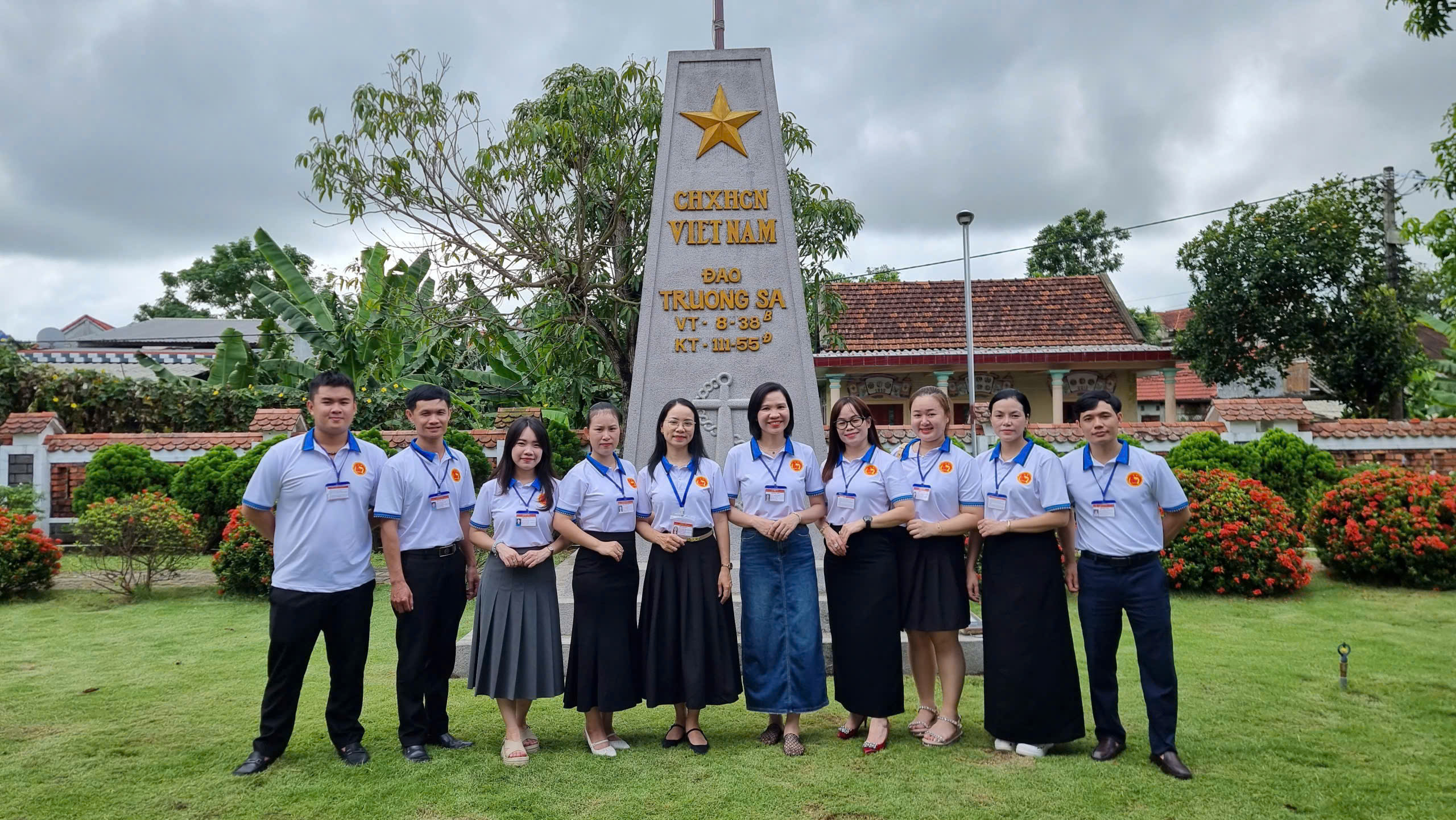 Đoàn chụp ảnh tại cột mốc mô phỏng cột mốc chủ quyền trên đảo Trường Sa năm 1988 tại thư viện Đại tướng Lê Đức Anh